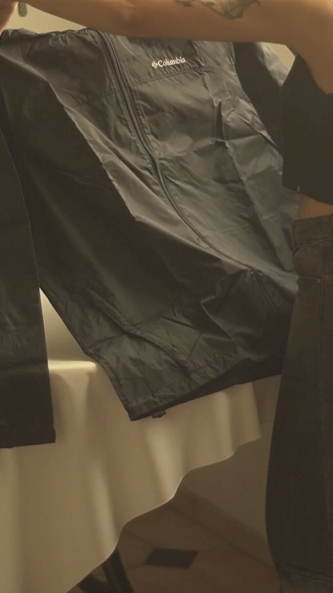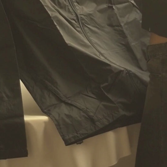 Toda la campera se guarda en uno de los bolsillos laterales: dale la vuelta al bolsillo plegable, guarda la campera dentro, sube la cremallera y listo.