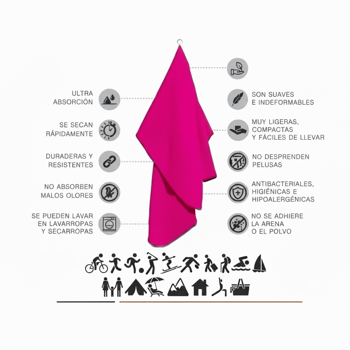 - Ligero, absorbente y compacto. Ideal para playa, deportes o escapadas.